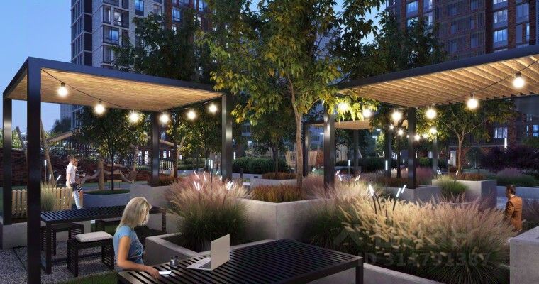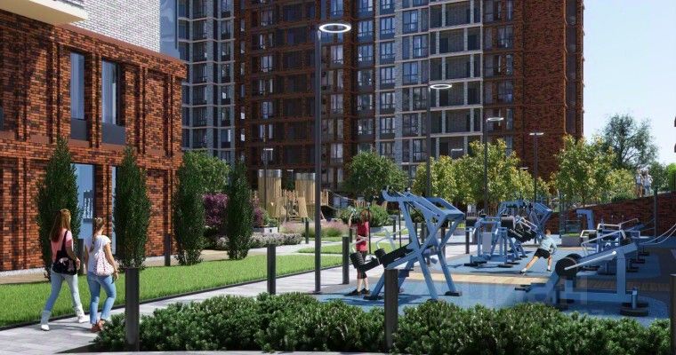 квартиры с интеллектуальными системами управления, умные домофоны с распознаванием лиц собственный парк площадью 35 000 кв.м. придомовая территория поделена на функциональные, природные и детские зоны строительство с использованием технологии вентилируемого фасада и архитектурной подсветкой