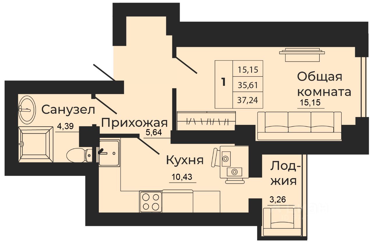 37 м² · Этаж 16 из 24