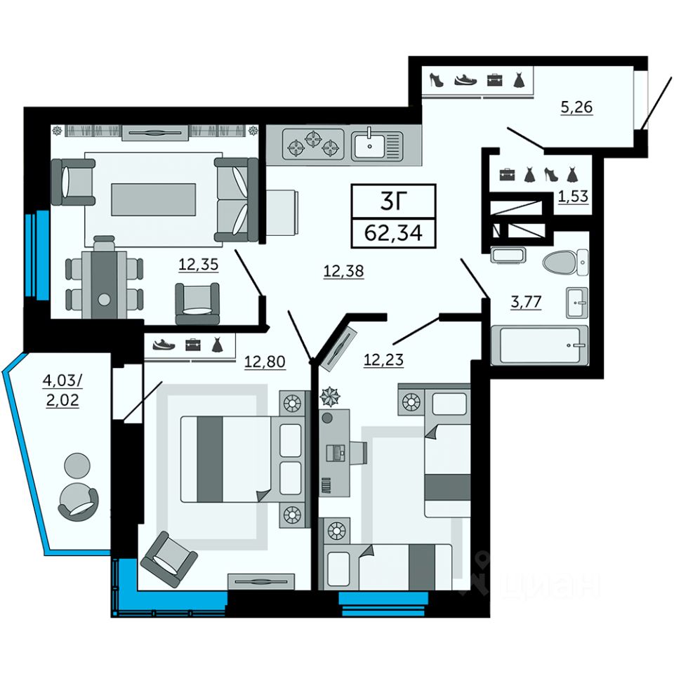 Продаётся 3-комнатная квартира в строящемся доме (Позиция 3), срок сдачи: IV-кв. 2025, общей площадью 62.34 кв.м., на 28 этаже. Жилой комплекс ''Донской Арбат'' от Московской Строительной Компании расположен по адресу г. Ростов-на-Дону, пр-кт Кировский, д. 89. Транспортная доступность Две центральные улицы - Красноармейская и Большая Садовая - находятся в пяти минутах езды. Удобная транспортная развязка позволит уехать в нужное вам место быстро и комфортно. Активный отдых возле дома На территории комплекса есть все для активного образа жизни: футбольное поле, несколько спортивных и детских площадок. В шаговой доступности - бассейн и стадион. Приятным дополнением является расположение рядом ''Ростовского ипподрома''. Комфорт в каждой детали Ощутите все плюсы недвижимости класса ''Комфорт+,''. Дома с бесшумными лифтами, дизайнерской отделкой входных групп, скрытыми нишами для кондиционеров, просторными планировками, панорамным остеклением балконов и лоджий. Идеальное местоположение Уникальная локация в центральной части Ростова-на-Дону позволяет быстро добираться в любой район города и в то же время - наслаждаться спокойной, неторопливой жизнью в стороне от оживленных магистралей.