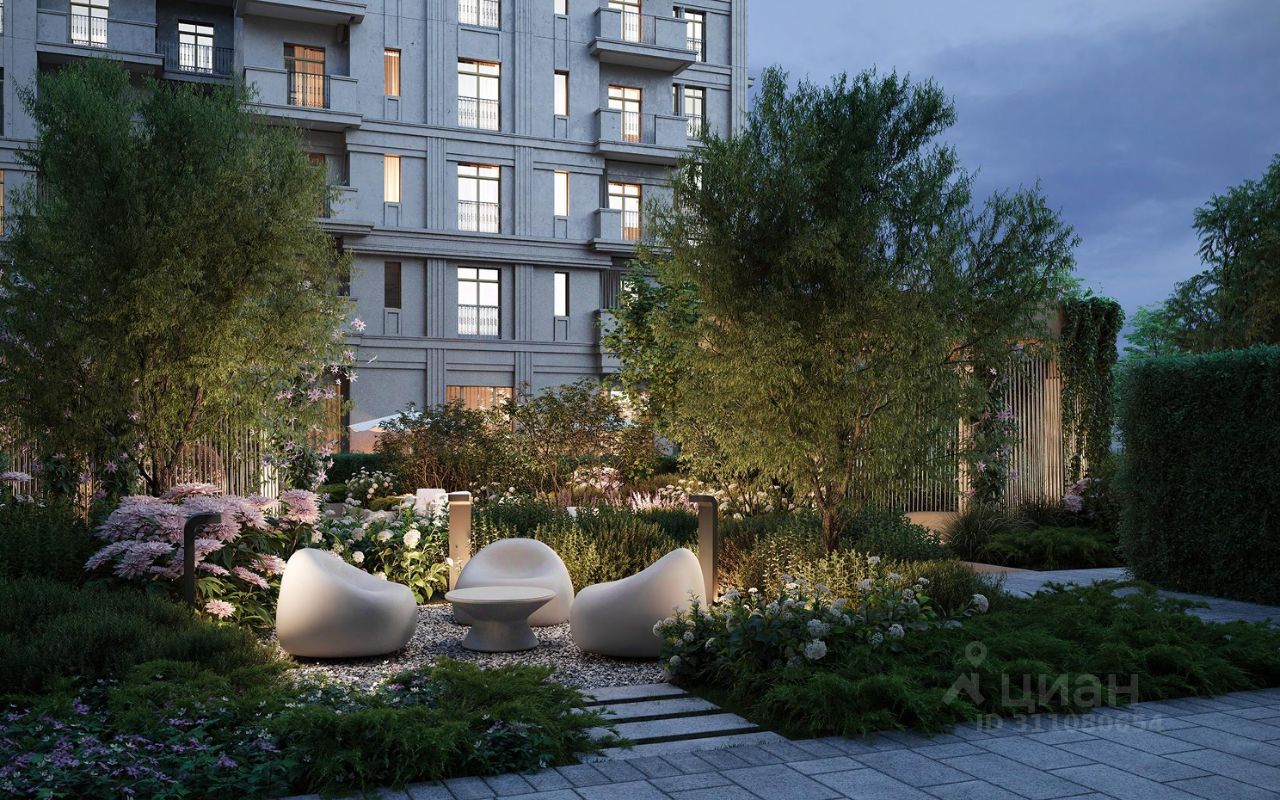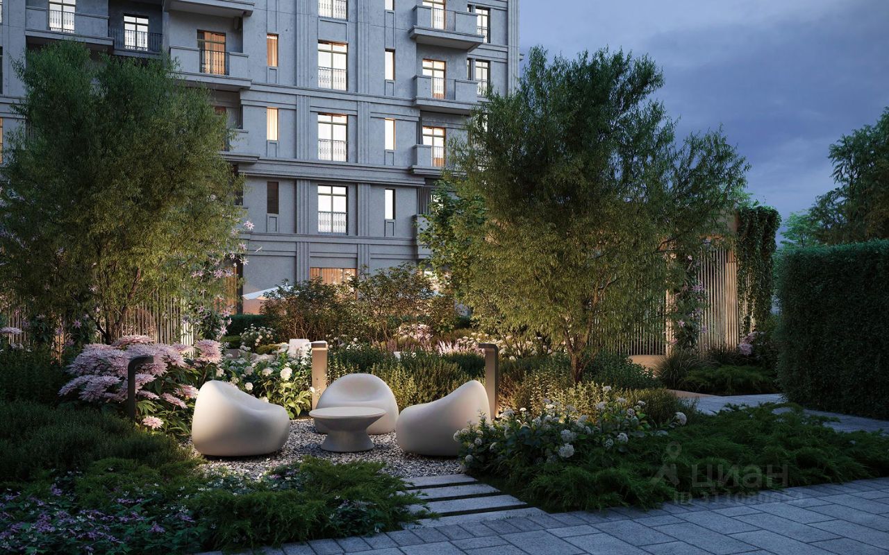 Цветущий двор-сад на 3600 кв.м. Двор-сад наполнен множеством цветущих растений, крупномерными деревьями и вечнозелеными кустарниками, чтобы вид из окна в любое время года радовал резидентов.