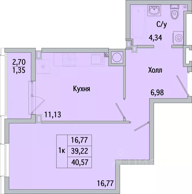 Общая площадь40,57 м2