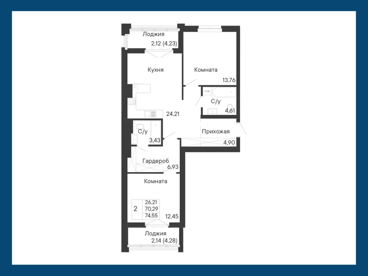 Общая площадь74,55 м2