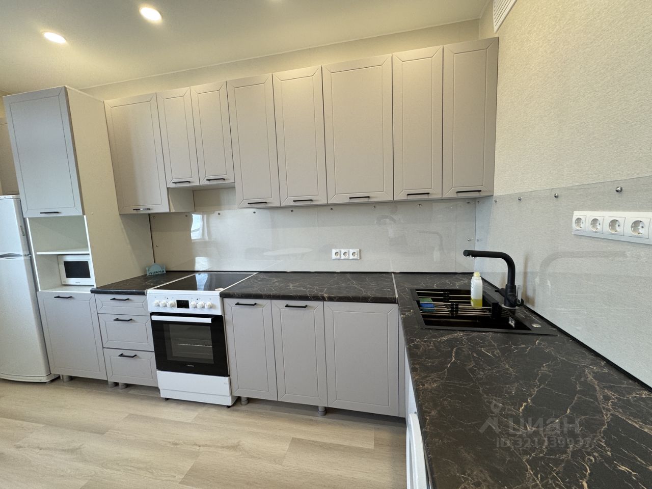 Встроенная кухня, много мест для приготовления еды. Двухкамерный холодильник, микроволновая печь, духовой шкаф